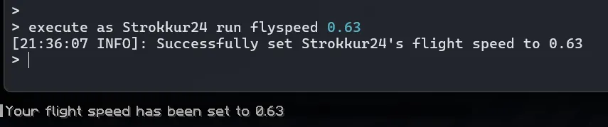 // If the speed was set by a different sender (Like using /execute) sender.sendRichMessage("Successfully set <playername>'s flight speed to " + speed, Placeholder.component("playername", player.name())); player.sendPlainMessage("Your flight speed has been set to " + speed); return Command.SINGLE_SUCCESS; }) );Explanation